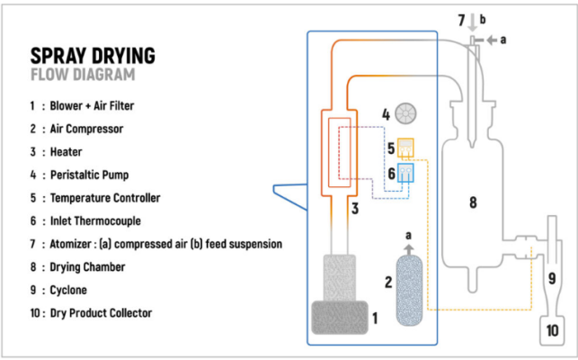 喷雾干燥通常被认为是一个更简单(和更快)的过程,涉及在一个步骤中将液体制剂转化为干粉。溶液被雾化成细小的液滴,然后在一个大室中使用热气体快速干燥。然后用旋风分离器收集所得干燥颗粒。