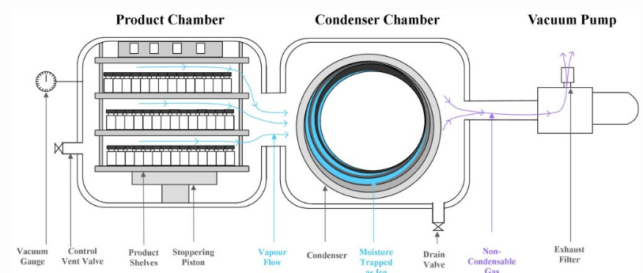 冷冻干燥的原理涉及以受控方式对产品进行初始冷冻,以控制冰晶结构。 然后将其置于真空中,在真空中进行升华(或初步干燥)以去除未结合的水。接下来是二次干燥以升华结合水,将材料降至用户定义的残留水分水平。此阶段的目标是结合水而不是未结合/游离水,因此需要更多的能量来通过将搁板温度提高到+20°C或更高来驱动该过程。当加上低气压时,它会导致冰直接变成水蒸气(通过液相),这个过程叫做升华。