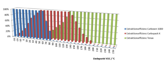 Needle trap技术可以复合多种不同的吸附剂填充在动态捕集针内,从而实现宽沸点范围(30-250℃)和更宽习性范围的化合物。常见的组合为Tenax TA(弱吸附剂)&Carbopack X或Carboxen1016(中等吸附剂)&Carboxen1000(强吸附剂),对整个沸点范围内的挥发物有更好的萃取效果。
