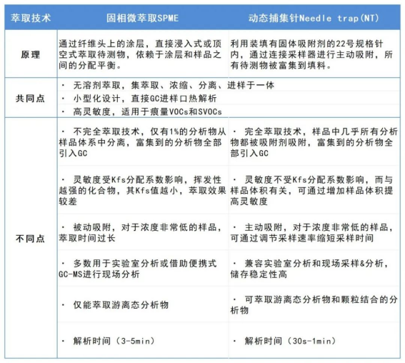 随着人们对绿色环保的重视,新的萃取技术追求小型化、无溶剂、简便,包括固相微萃取(SPME)和动态捕集针技术(Needle trap,NT)。分析痕量挥发性有机物,该这如何选择合适的前处理技术呢?我们先来分别了解一下这两种技术。