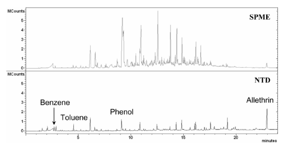 蚊香[4]样品使用固相微萃取(SPME)和动态针捕集(Needle trap)技术想结合来简单快速地测定游离和颗粒结合的化合物。下图结果表明,SPME对极易挥发的物质,由于Kfs值低,所以萃取效果不是很好,半挥发性物质因为挥发性弱,也不容易被萃取,对位于色谱图中间的挥发性有机物具有较高的萃取效率。NTD由于萃取相体积较大,对更易挥发的化合物的萃取率较高,而对颗粒结合的丙烯酸酯有更高的提取效率。