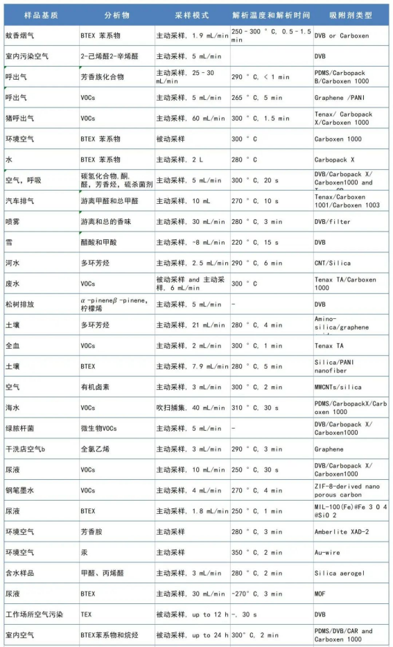 NTDs被广泛用于不同类型样品,在固体和液体样品中提取挥发性和半挥发性化合物气态化合物的应用,包括呼吸气、香气(植物,食品)、环境(水,土壤,空气等)和生物(尿液,血液等)等基质,表2[5]列出各种吸附剂类型用于不同基质的分析。