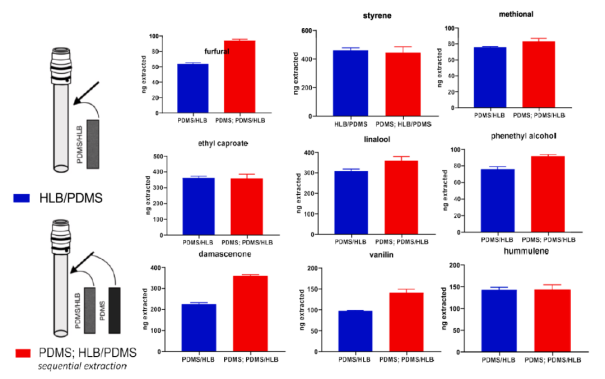 PDMS涂层的TF-SPME薄膜对非极性分析物表现出良好的选择性和萃取性能,但对于低LogP的糠醛、甲缩醛、苯乙醇、香兰素等极性分析物几乎没有萃取效果,所以需要叠加使用PDMS/HLB涂层的TF-SPME薄膜对其极性化合物进行萃取。下图表示,使用分步TF-SPME薄膜固相微萃取(红色)提取的极性化合物(包括糠醛、苯乙醇和香草醛)的量明显高于单独使用 HLB/PDMS TF-SPME (蓝色)萃取的量,达到了1+1>2的效果!