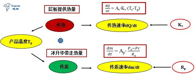 冻干是一个在冻干设备上完成传热传质接力赛的过程,其目标是快速将溶剂去除的同时确保良好的产品性能,其中的一个环节发生问题,就会导致冻干效率的降低或者能量过剩导致的产品温度上升,造成产品性能受损。除去设备性能主导的两个环节,剩余的就是传热和传质部分。传热和传质过程共同决定着产品的温度,如果我们把这个过程看成是一个稳态的过程,传热和传质方程式表示如下: