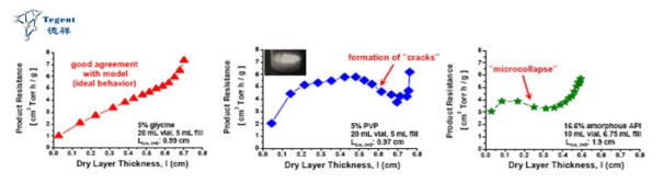 当升华过程中,产品结构发生塌陷、微塌陷或开裂等,在产品内部会形成一定的额外升华通道,通常情况下产品阻力会降低,这个时候也可以通过产品阻力数据或曲线来追踪样品是否发生了如上的这些质量现象,从而进一步进行工艺调整,优化产品质量。如图1,第一张是正常升华的阻力曲线图,随着干燥层的厚度增加,阻力呈现逐渐上升的趋势,后面两张是产品发生开裂和微塌陷时,升华阻力在中间出现了突然降低的现象。