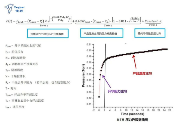 MTM方法即Manometric Temperature Measurement:关闭隔离阀25s, 监测压力升高的数值,得到产品温度和压力升高数据之间的关系式,压力升的数据由三部分组成,升华阻力主导的压力升,产品温度主导的压力升以及热传导导致的压力升,如下所示: