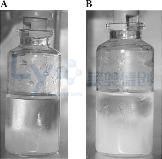在两步冷冻过程中,由于小瓶中的配方首先被冷却至-10°C(高于冰核温度)并达到平衡,因此产品在整个溶液中保持过冷状态。当搁板温度快速下降时,发生快速冻结(图2A),在整个溶液中形成相对均匀的冰(图2B)。