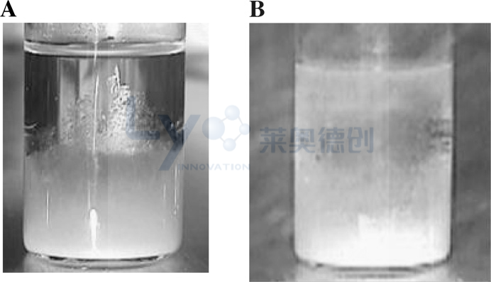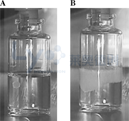 图3:单步冷冻工艺的SBECD+5%TBA的冷冻行为照片A:冰晶脱离并浮起;照片B:快速自上而下冻结