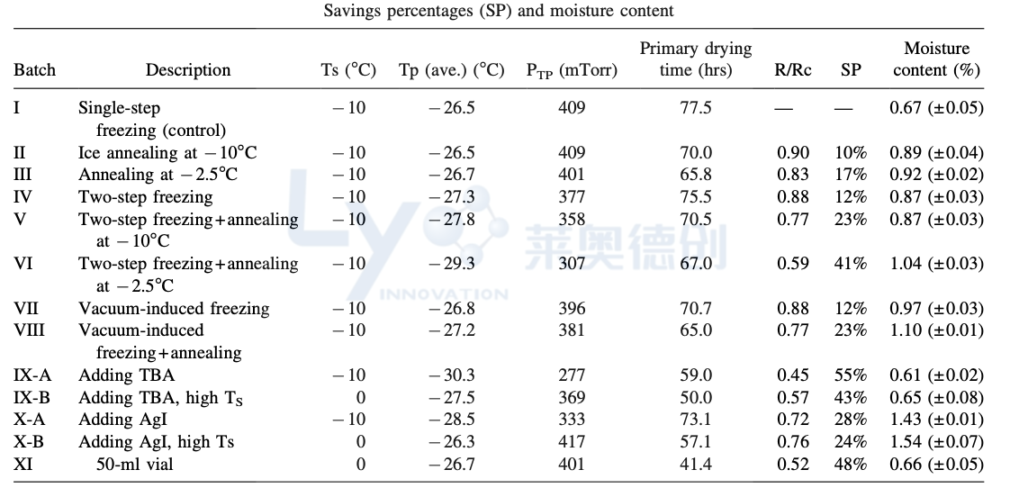 在对照批次(批次I)中,使用了药品冷冻干燥生产中典型的冷冻工艺:[5]以0.3°C/min的速度将搁板温度从5°C降至-45°C,并保持3小时,以确保所有小瓶中的产品完全冷冻和固化。