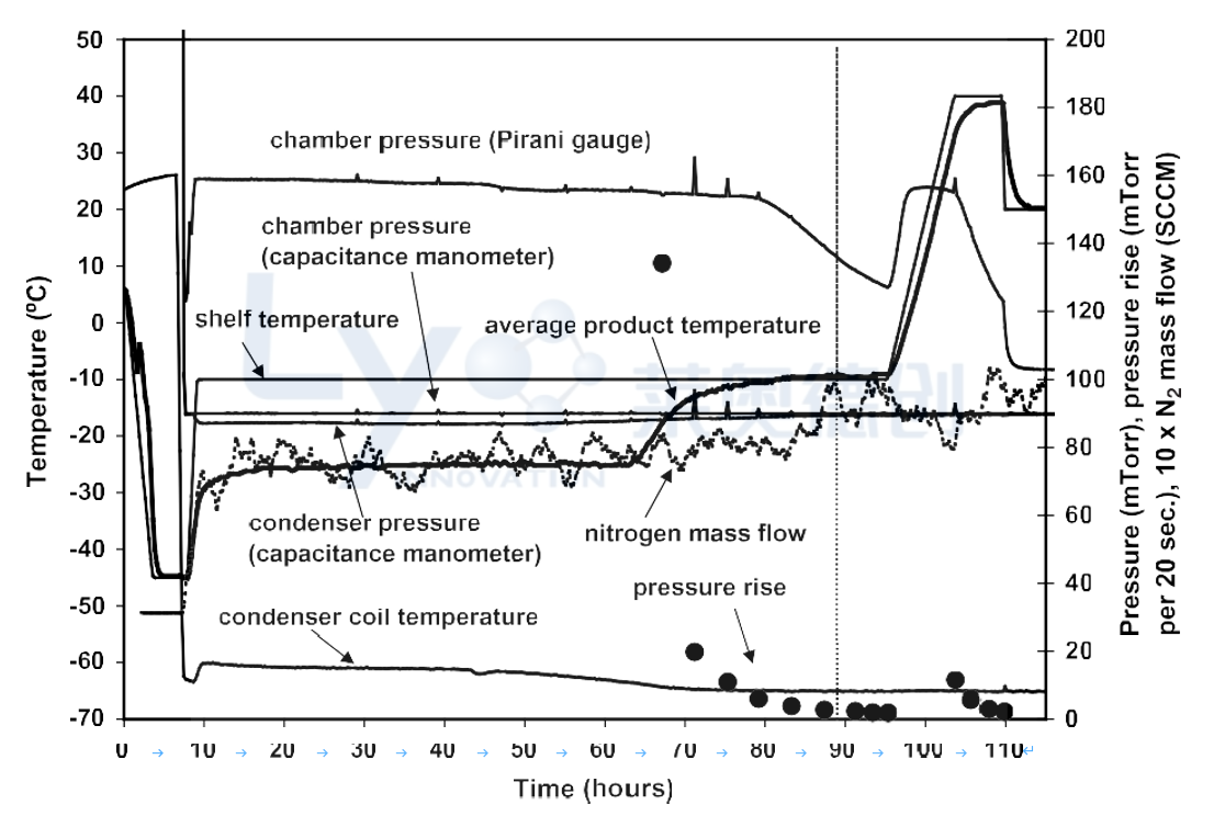 这一批的周期时间确实很长,持续了4天多。建立了压力上升和其他过程变量之间的相关性,包括热电偶测量的产品温度、比较压力(电容压力计与皮拉尼压力计)、腔室和冷凝器之间的压降、N2流速和冷凝器盘管温度(见图6)。结果,建立了隔离阀每20秒关闭时间4毫托的压力上升标准,用于确定冰升华(一次干燥)的终点,并用于自动控制所有其他批次中从一次干燥到二次干燥的循环推进,但批次#VIII除外,其由产品温度确定。这意味着,如果在测试期间压力上升小于每分钟12毫托,则冰升华应该完成。